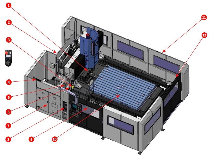 1. Магазин на 5 інструментів. 2. Дверцята магазину. 3. Ручний пульт керування (MPG) з LCD-дисплеєм. 4. Масляний охолоджувач і трансформатор. 5. Гідравлічний блок і мастильний насос. 6. Педаль керування. 7. Головна електрична шафа. 8. Повітряний пристрій. 9. Дверцята оператора. 10. Стіл (2000.3000 мм). 11. Захисна огорожа (опція). 12. Передні двері та сходинка.